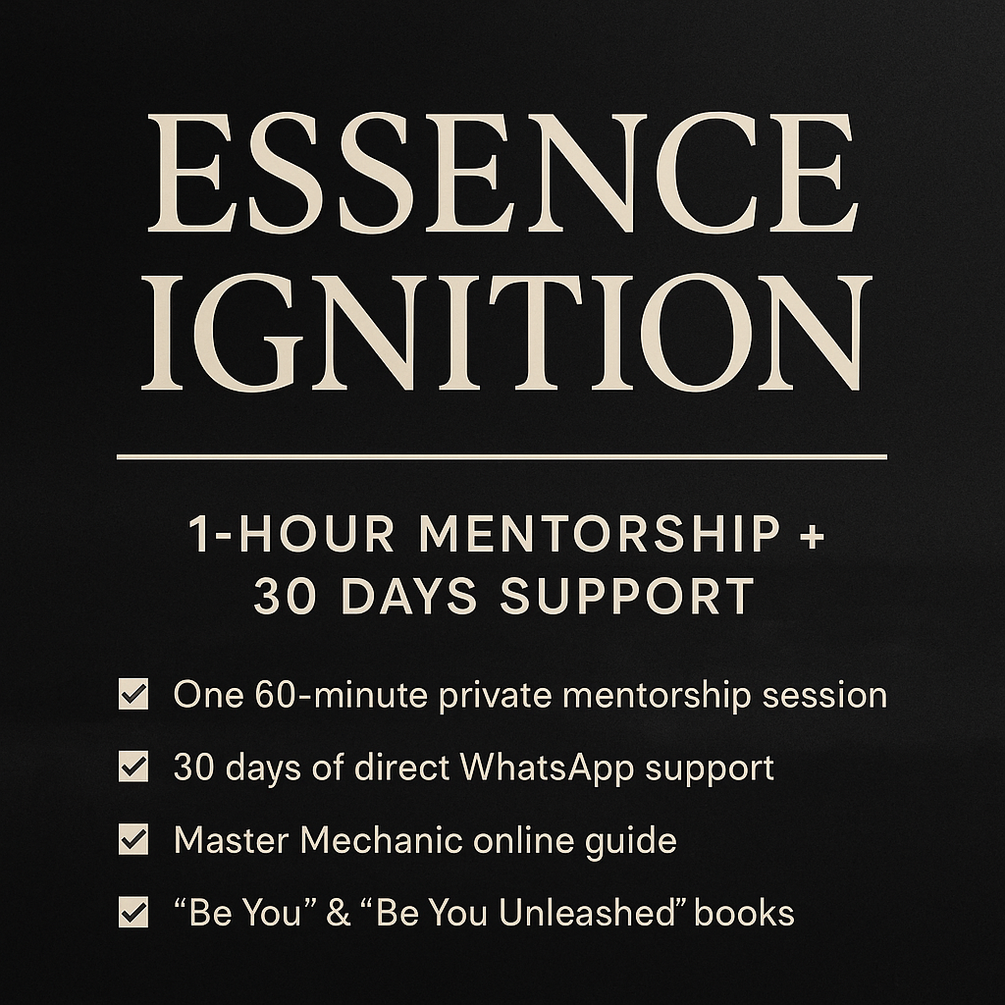1-Hour Mentorship + WhatsApp Support + Full Master Mechanic Voice-Guided System (MP3 format) Be You eBook — Life Realignment Edition Self-Tracking Journal & Recalibration Prompts £50 Voucher toward a full in-person recalibration session with Reg Instant Lifetime Access Updates Included